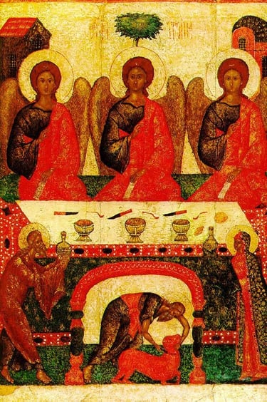 Im Hinblick auf Chistus: Der mittlere Engel trägt ein für Christus farblich typisches rot-blaues Gewand mit einem Clavus [5], im Heiligenschein steht das Ὁ ὬΝ, das auf die Selbstoffenbarung Gottes an Moses im Alten Testament und letztendlich auf Christus als Gott verweist. Die Genesis ist hier eindeutig, denn „Gott zeigte sich ihm an der Eiche“ (Gen 18, 1) in menschlicher, männlicher Gestalt, denn „Als er aber mit seinen Augen aufblickte, sah er, und siehe, drei Männer standen vor ihm“ (Gen 18, 2). Die Engel gehen und Gott bleibt bei Abraham: „Und nachdem sich die Männer von dort weg gewandt hatten, kamen sie nach Sodom. Abraham aber stand noch vor dem Herrn“ (Gen 18, 22) und „Die beiden Boten aber kamen am Abend nach Sodom“ (Gen 19, 1). Zwei gehen, einer bleibt. Gott selbst bezeugt Moses: „Du sollst mein Antlitz nicht anblicken können; denn auf keinen Fall wird ein Mensch mein Antlitz sehen und dann weiterleben“ (Ex 33, 20), daher sagt die Kirche, es ist wahr, den Vater und das Wesen Gottes kann man nicht sehen, Christus aber wohl: „Niemand hat Gott jemals gesehen; der einziggezeugte Sohn, der in des Vaters Schoß ist, der hat ⟨ihn⟩ bekannt gemacht“ (1. Joh 1, 18). Christus war sogar vor der Inkarnation erfahrbar, wie Abraham, Moses, Gedeon (Richter 6, 22) und andere Propheten bezeugen. Dies ist nicht allen Gläubigen bekannt, der hl. Andrei malte – oder schrieb - es ganz freimütig.