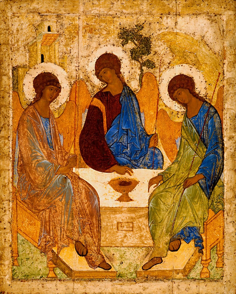 Die Dreiheitsikone basiert auf der gängigen Ikone der Gastfreundschaft Abrahams. Getreu der alttestamentlichen Geschehnisse bedienen Abraham und Sarah drei Männer (Gen 18, 1-3), die schon als Engel dargestellt werden, obwohl erst ein Kapitel später von Boten die Rede ist und damit Engel angedeutet werden (Gen 19, 1). Der heilige Andrei entfernt Abraham und Sarah aus dem Bild und macht aus den drei Männern nicht einfach normale Engel, wie die gängigen Ikonen dieser Szene, sondern Representationen der Personen der Trinität. Das geht über das, was in Genesis 18 steht, hinaus, obwohl das Wort Engel genau so Bote bedeutet.